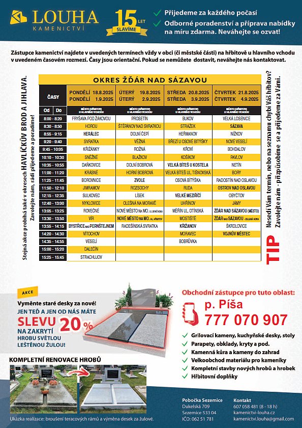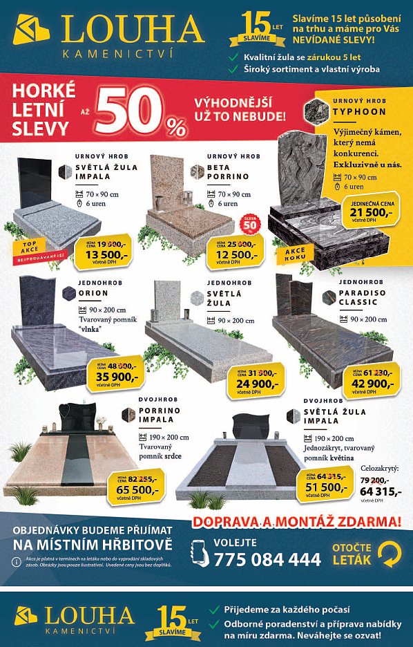 Pokud máte zájem, přijďte na hřbitov v datu a čase uvedeném na letáku, kde Vám bude k dispozici zástupce Kamenictví Louha s.r.o.