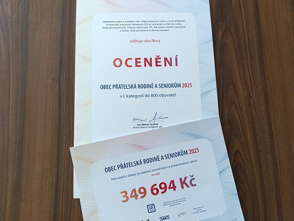 Naše obec Bory se stala jednou z oceněných v prestižní soutěži Obec přátelská rodině a seniorům 2025. Slavnostní vyhlášení proběhlo 1. října v pražském Kaiserštejnském paláci, kde nám ocenění a symbolický šek předala náměstkyně ministra práce a sociálních věcí Šárka Jelínková (KDU-ČSL).